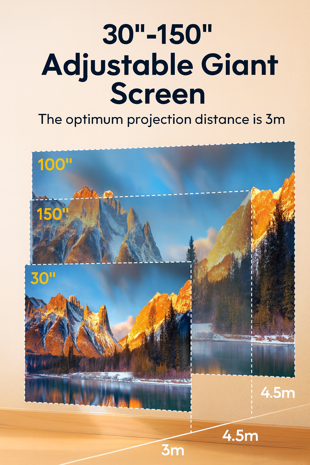 It can project a screen from 45 to 130 inches, easily adapting to any space.